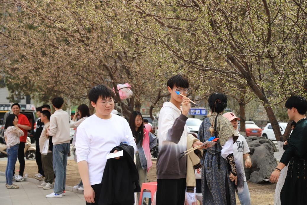 活动现场,有的同学身着汉服,沉浸式体验中华传统赏春项目,还进行了古筝、丽人行、歌曲等节目表演,随着古风古色的旋律、打动人心的歌声与舞蹈,让同学们身临其境的感受着春日校园的古风画意,在春日的映衬下为同学们带来一场视觉与文化的双重盛宴,吸引着众多途径的师生和校园工作人员驻足于此,与我们一起在互动环节,吟诗作赋,书写墨韵。此次活动还意外吸引到一位“鹤发校友”,他欣然提笔,在同学们的赞叹和欢笑声中为大家留下了美好的春日祝福。