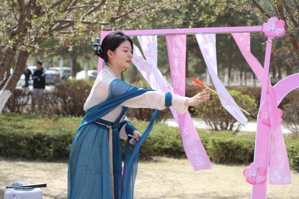 本次活动旨在引导同学们近距离感受春日风光,沉浸式体验中华传统文化。活动设置了品桃花糕、投壶、书法、飞花令中华传统文化的赏春项目,参与者可共同循着轨迹一同寻春花,觅春知,踏春景,获春礼。