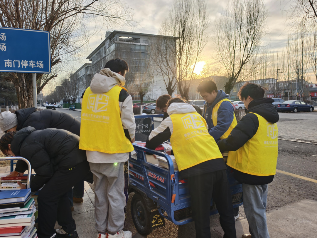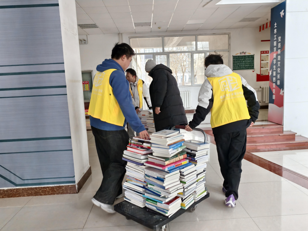 志愿者来到学校图书馆,将700余册图书进行整理,运送至成人在线