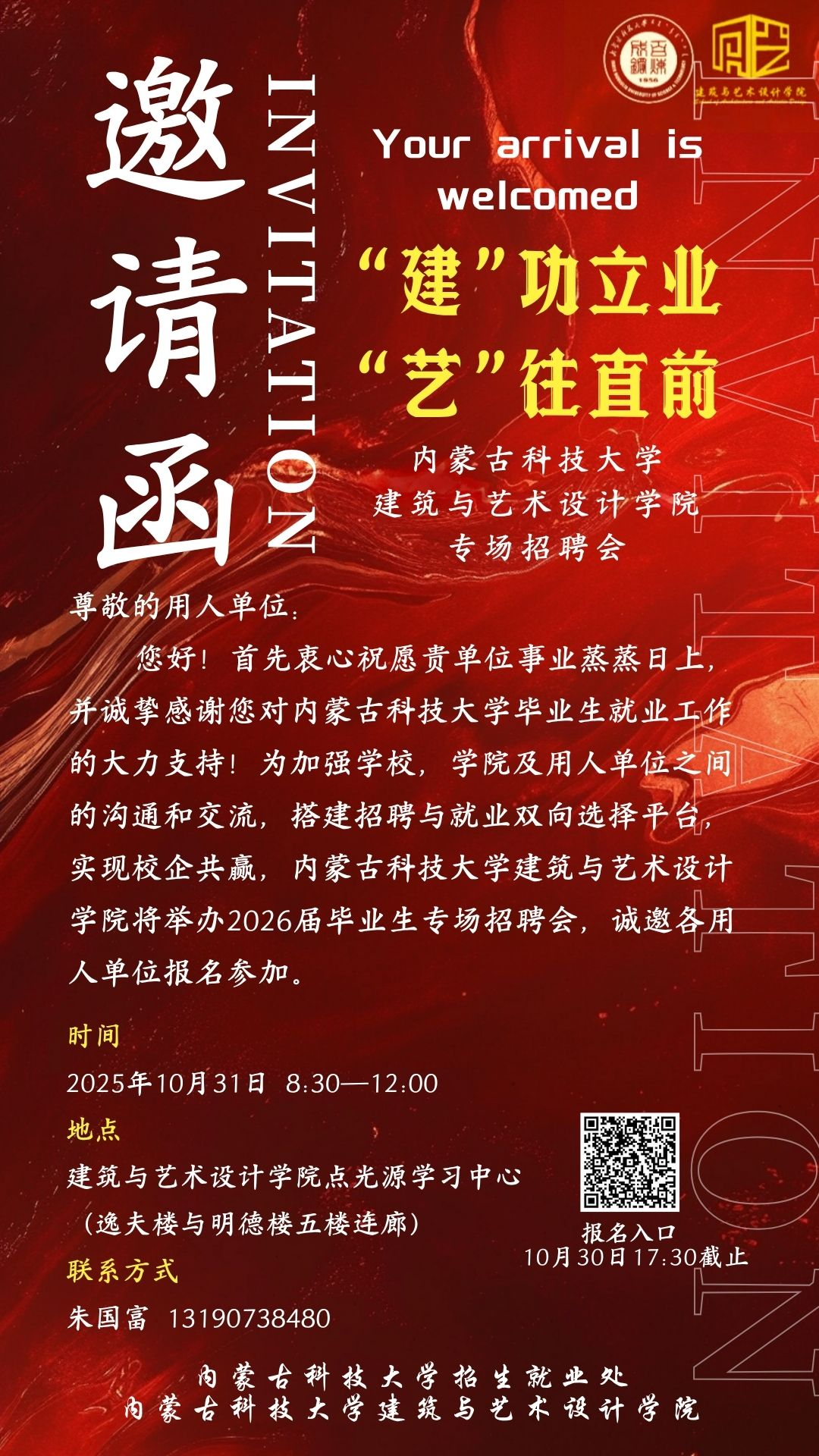 为搭建校企双向选择优质平台,实现人才精准对接与合作共赢,成人在线 定于2025年10月31日8:30-12:00,在点光源学习中心(逸夫楼与明德楼五楼连廊) 举办2026届毕业生专场招聘会,诚邀各用人单位莅临甄选英才!