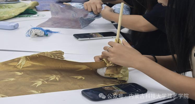 进入实践环节,同学们在指导下有序开展制作。大家领取艾草、填充棉、精美布料、装饰动手实践:巧手制作香锤,艾香浸润心田绳等材料,认真进行布料裁剪、艾草填充、均匀压实、绳结捆扎、细节装饰等步骤。现场氛围温馨热烈,同学们专注投入、互帮互助,交流制作心得,分享创意灵感。一个个造型美观、香气清新的艾香养生锤在指尖诞生,兼具实用性与观赏性,让大家在动手过程中充分体会传统手作的乐趣与温度。