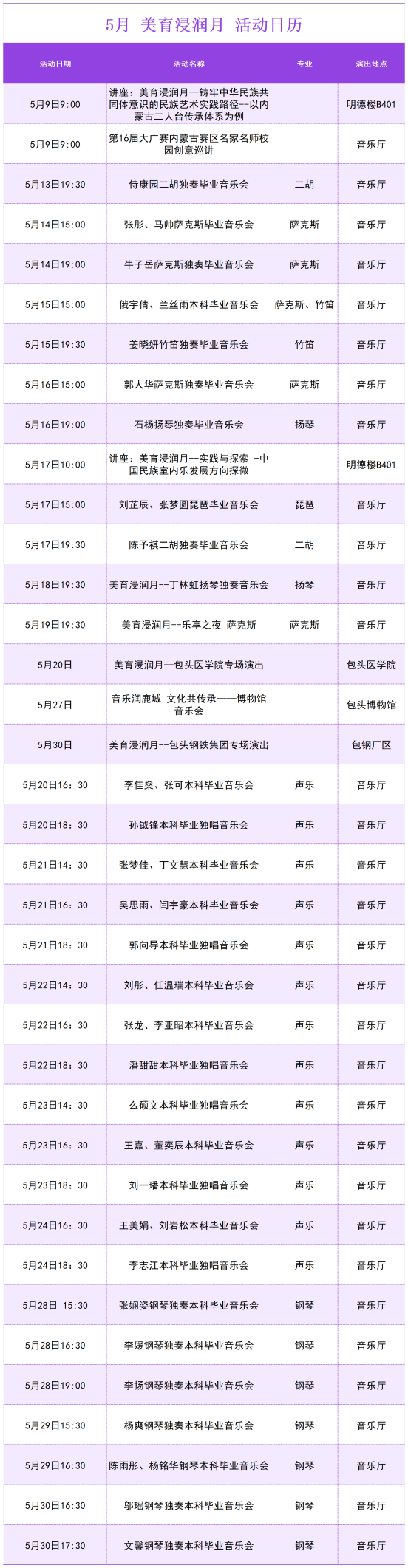 音乐系师生二胡、萨克斯、竹笛、扬琴等音乐会及赴包头医学院、包头博物馆和包头钢铁集团等地开展美育浸润演出等活动。