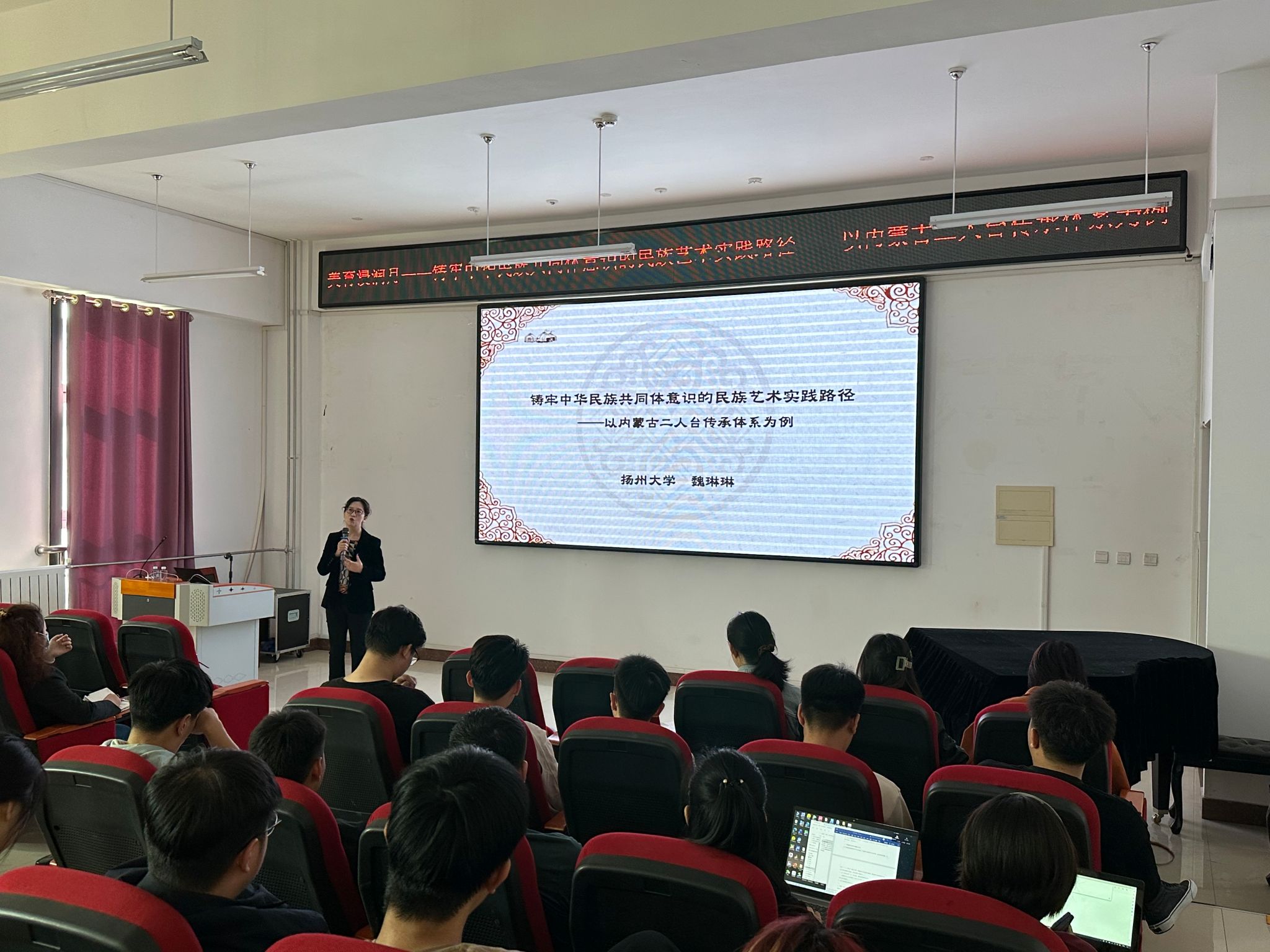 李志春副院长主持,吸引了音乐表演专业的全体师生到场聆听。魏琳琳博士现为扬州大学特聘教授、硕士研究生导师,中央音乐学院博士、中央民族大学博士后、南京大学访问学者,并获内蒙古自治区“草原英才”工程青年创新创业人才、江苏社科优青、江苏省“双创人才”等多项荣誉称号。