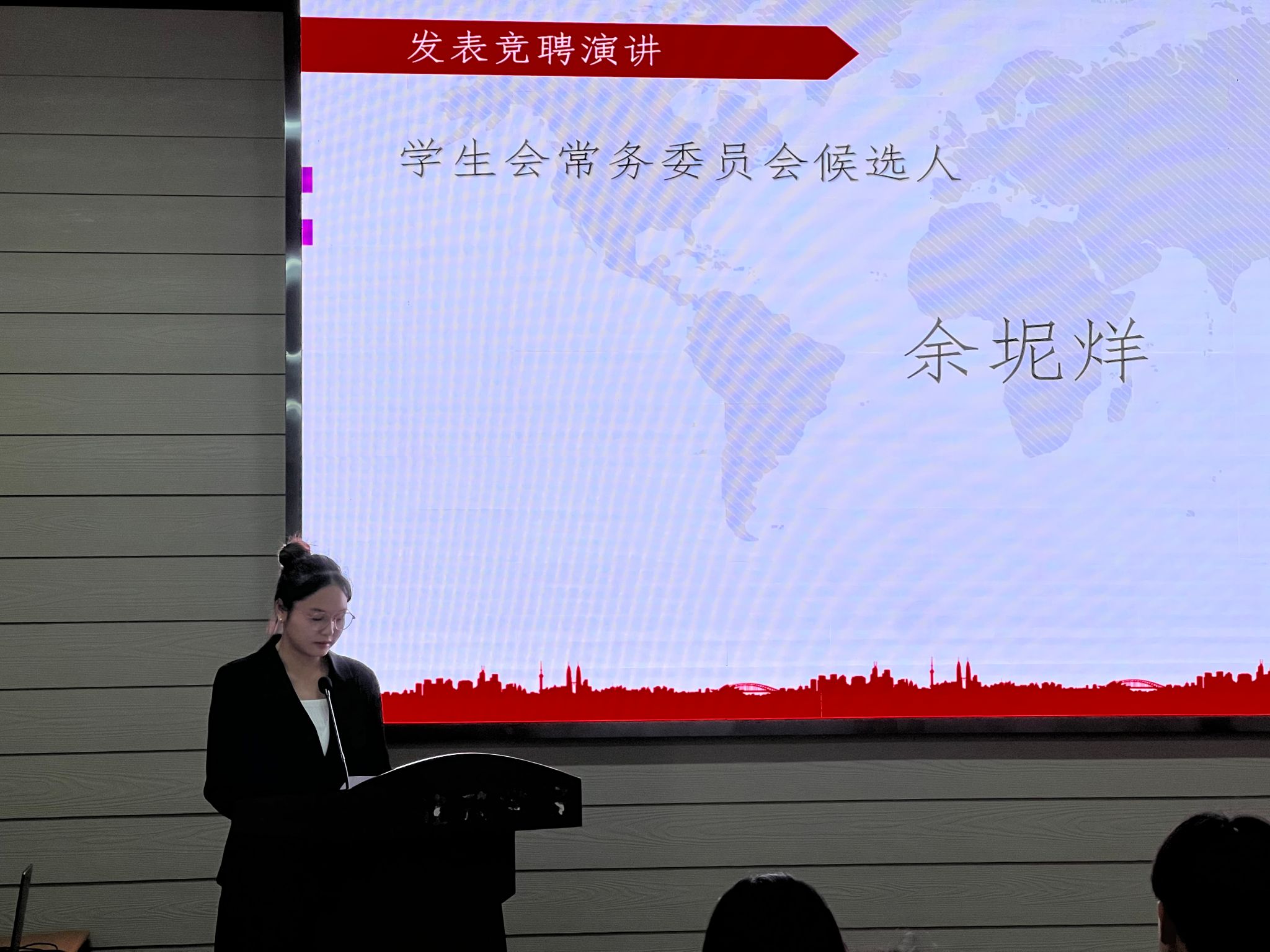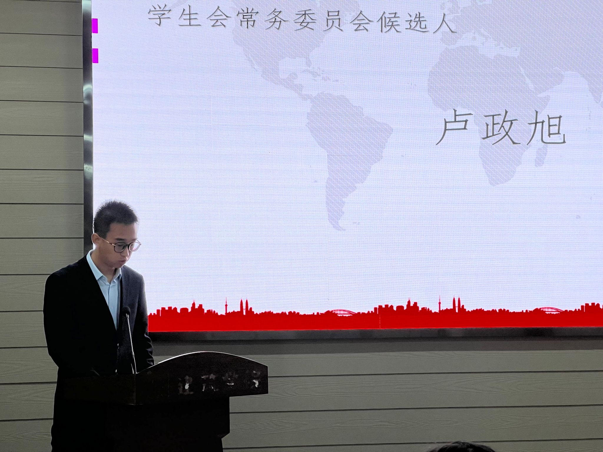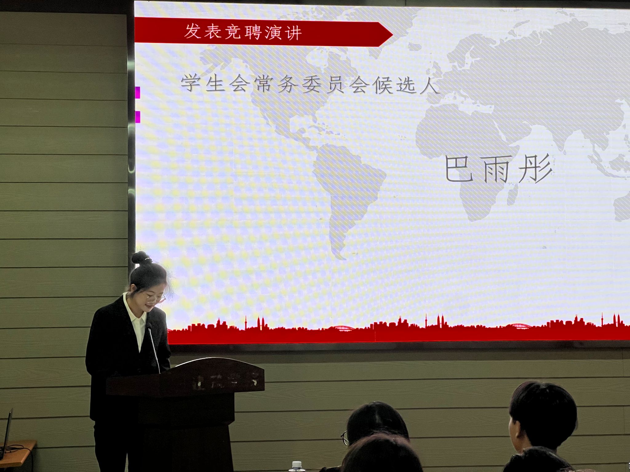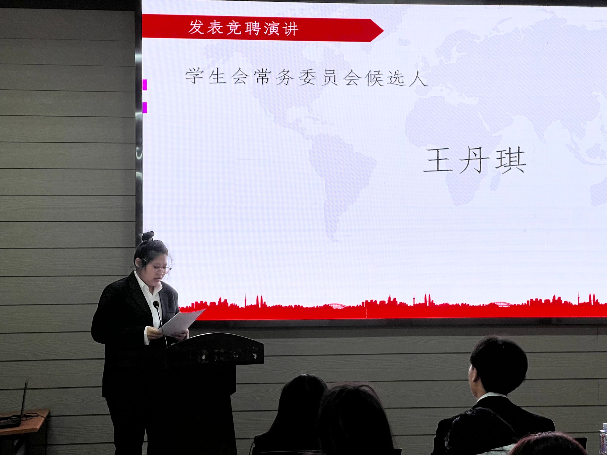 大会在庄严的国歌声中拉开序幕。会议第一项由上一届学生常务委员会代表王佳磊、吕琦同学作2022-2023年度学生会工作述职报告,对过去一年各部门的工作进行总结。随后新一届学生常务委员会候选人依次发言,他们分别从自我介绍、竞选优势和未来展望进行演讲,充分阐述了自己竞选的实力与信心。